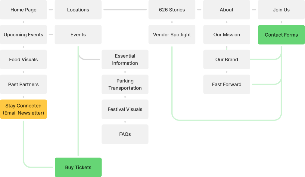 During the discussions with stakeholders and organizers, I created a site map with all the key components needed on the website.