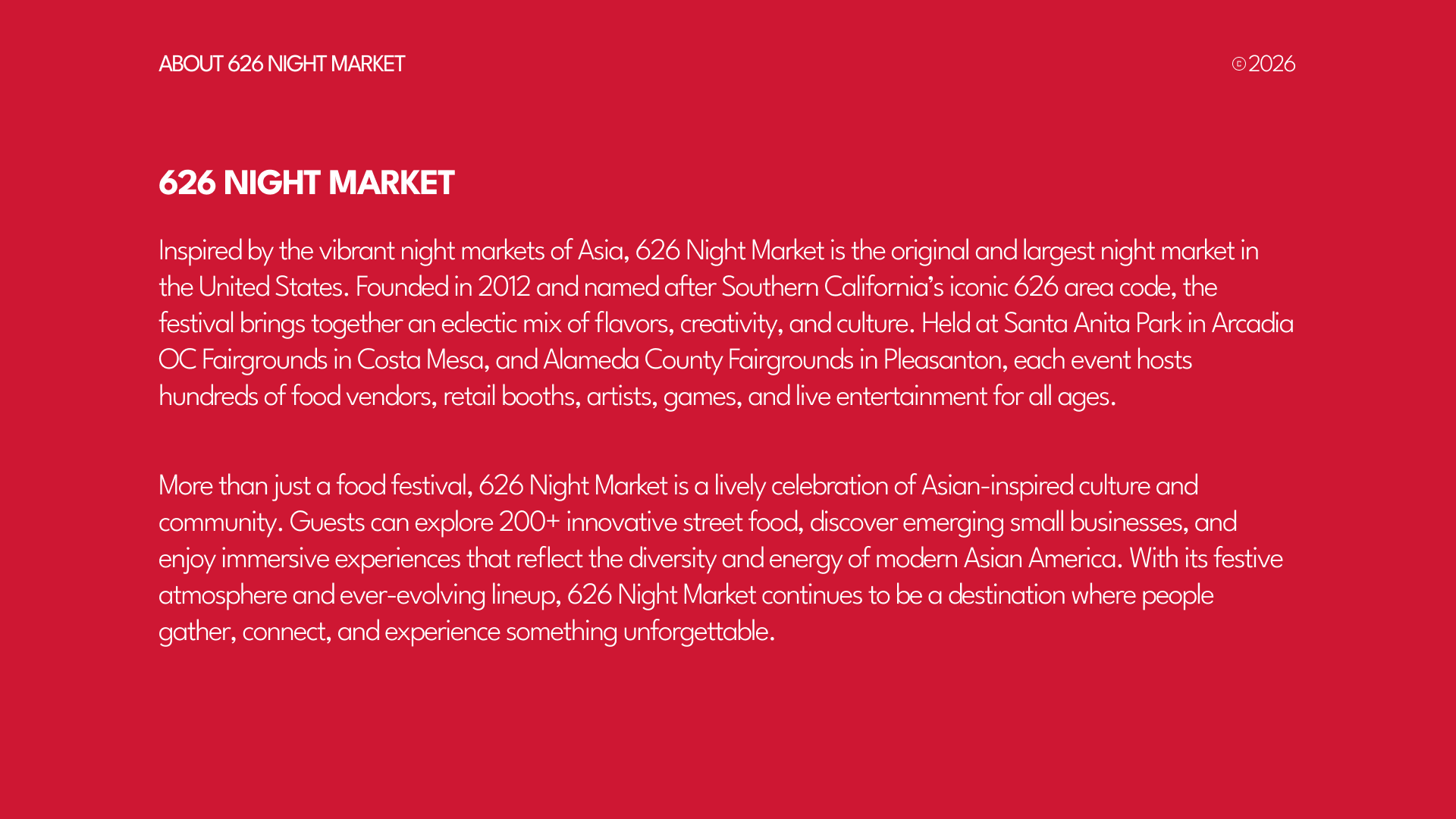 626 Night Market is the original and largest Asian night market in the U.S., drawing tens of thousands of visitors every season and offering hundreds of vendors a platform to grow their businesses. With the transition to new ownership, there was a critical need to professionalize the web platform. The goal wasn't just to look better; it was to build a reliable infrastructure for business growth.